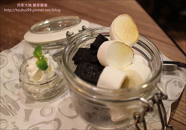 美味的料理總是有結束的時候,最後的 [甜點-巧克力布朗尼佐棉花糖]就是最美好的ending囉!!